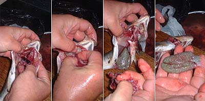 尻の穴に出刃の先をホンの少し入れ、卵を傷つけないように割いていく。(写真3) - 内臓と卵を取り分ける。