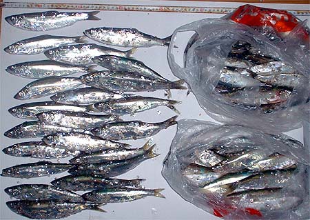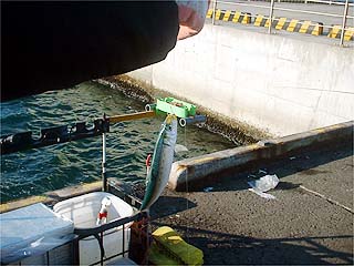 | カタクチに混じって、マイワシも釣れる | ニシン・3匹も掛かると抜きあげるのが大変! |