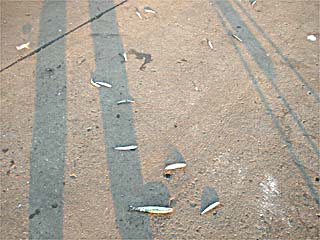 入れ食いだ。3匹も同時に付くと、抜きあげられない。奥の悲鳴が聞こえる。隣のおじいさんも、たくさん釣れるので口数も多い。釣りながら奥と談笑していた。暗いので、おじいさんが「これから帰る」と携帯で電話しているのに、奥が「ハイ」と返事をしていた。おじいさん「電話してるんです!?」 魚が釣れていると、こんな楽しい会話もはずむと言うもんだ。 奥と二人で1時間くらいの間に、150匹くらい釣り上げた。