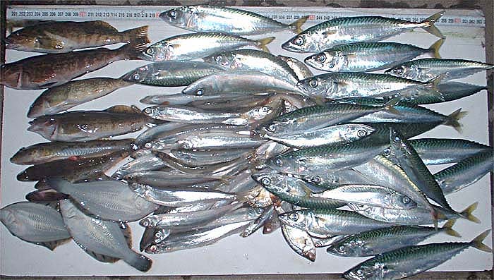 サバは写真に写っているのは釣れた半分くらい。今回ウグイが釣れなかった。それと豆イカが1杯釣れた。 |
