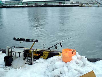 スコップを持っていってたので、少し雪を削ったりして右のように竿をセットした。(冬場の埠頭釣りにはスコップがあると便利)