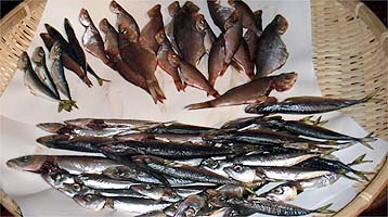 豆イカ14ハイ、サバ59匹、カタクチ63匹、タナゴ20匹
