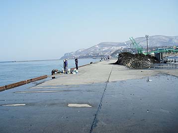 南防波堤を出て、2番目の交差点を右に曲がると、若竹岸壁という釣場がある。海に向かって右側は、南防波堤がよく見える。こちら側はあまり釣り人はいなかった。水深は浅いがチカや小サバがよく釣れることがある。正面と左側には、投げ釣りの人がたくさんいた。ここで、隣の釣り人が大きいクロガシラを釣ったことがある。