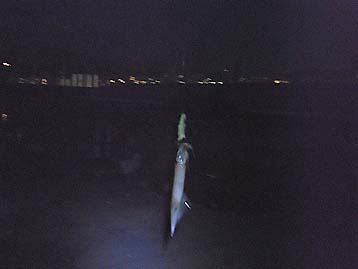 最初ヤリイカが釣れたのは、午後6時54分だった。この時は浮きが左の方に流れていたので巻いてくるとついていたという感じだった。この時はこの1ハイしか釣れなかった。次に釣れたのは、約1時間後の8時01分。この時は群れが濃かったのか、30分くらいの間に4ハイ釣ることが出来た。イカの仕掛けは1本しか出していなかったので、もう1本出そうと準備をしていると、浮きが沈んでいるのを見た奥が一生懸命、リールを巻いている。イカの抵抗で、「リールが巻けない!」と叫んでいたが、何とか無事に大きいヤリイカをダブルで上げることができた。