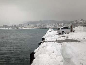 前回の釣りでニシンがたくさん釣れた若竹岸壁に寄ってみたが、除雪が全くされてなく、前回の場所で釣るのなら、50メートルくらい雪をこいで行かないといけない。誰も釣ってないので釣れそうな気はしたが…スルーすることにした。