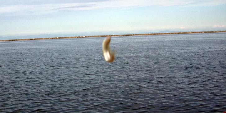 まず、素針サビキ仕掛けの竿を2本出した。……が、時すでに遅し、さばの群れは通り過ぎてしまっていて、チビフグが時折竿をゆらすくらいのさびしい時間が過ぎていった。が辛抱しているとそのうちサバが廻ってくるだろうとサビキの竿は2本出したままにしておいた。