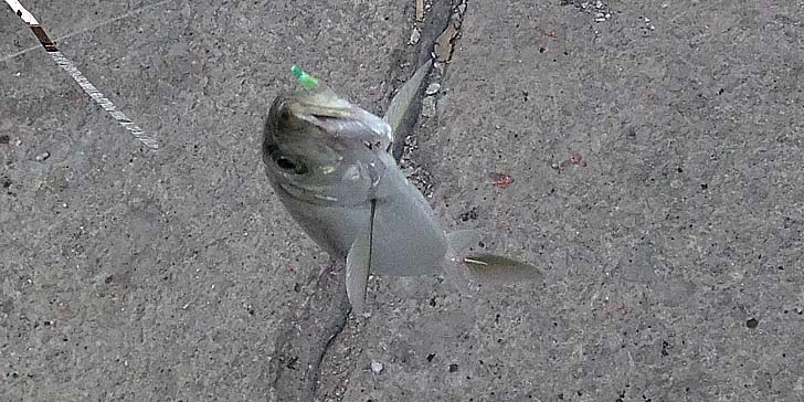 釣れない時間が長かった。 前回と同じく海面を漂っている迷いイワシを掬うことができた。3匹ゲット。