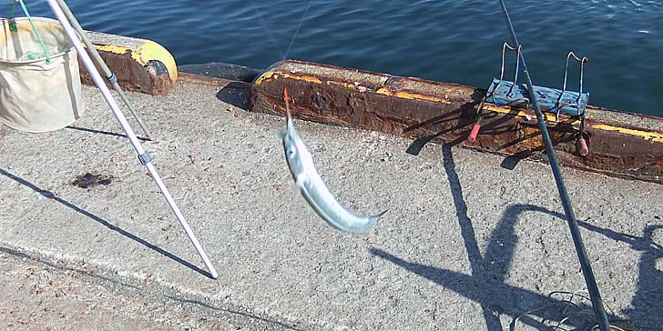 今回も20〜25センチくらいのサヨリがよく釣れた。イワシ、サバも回遊がある時に少し釣れた。